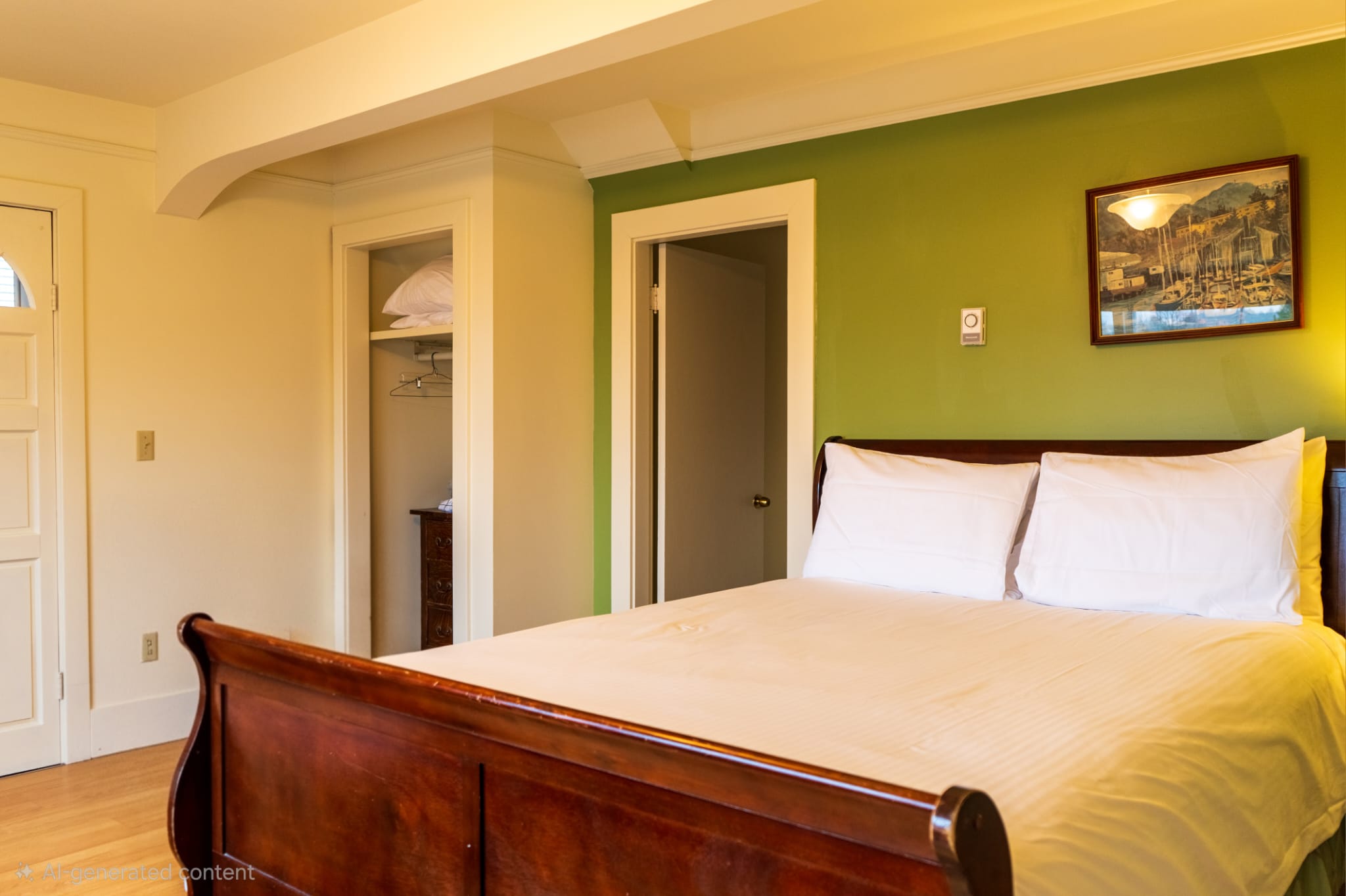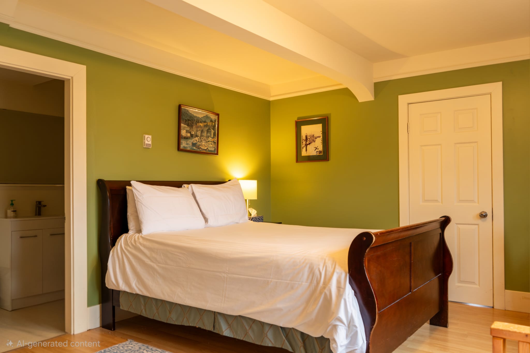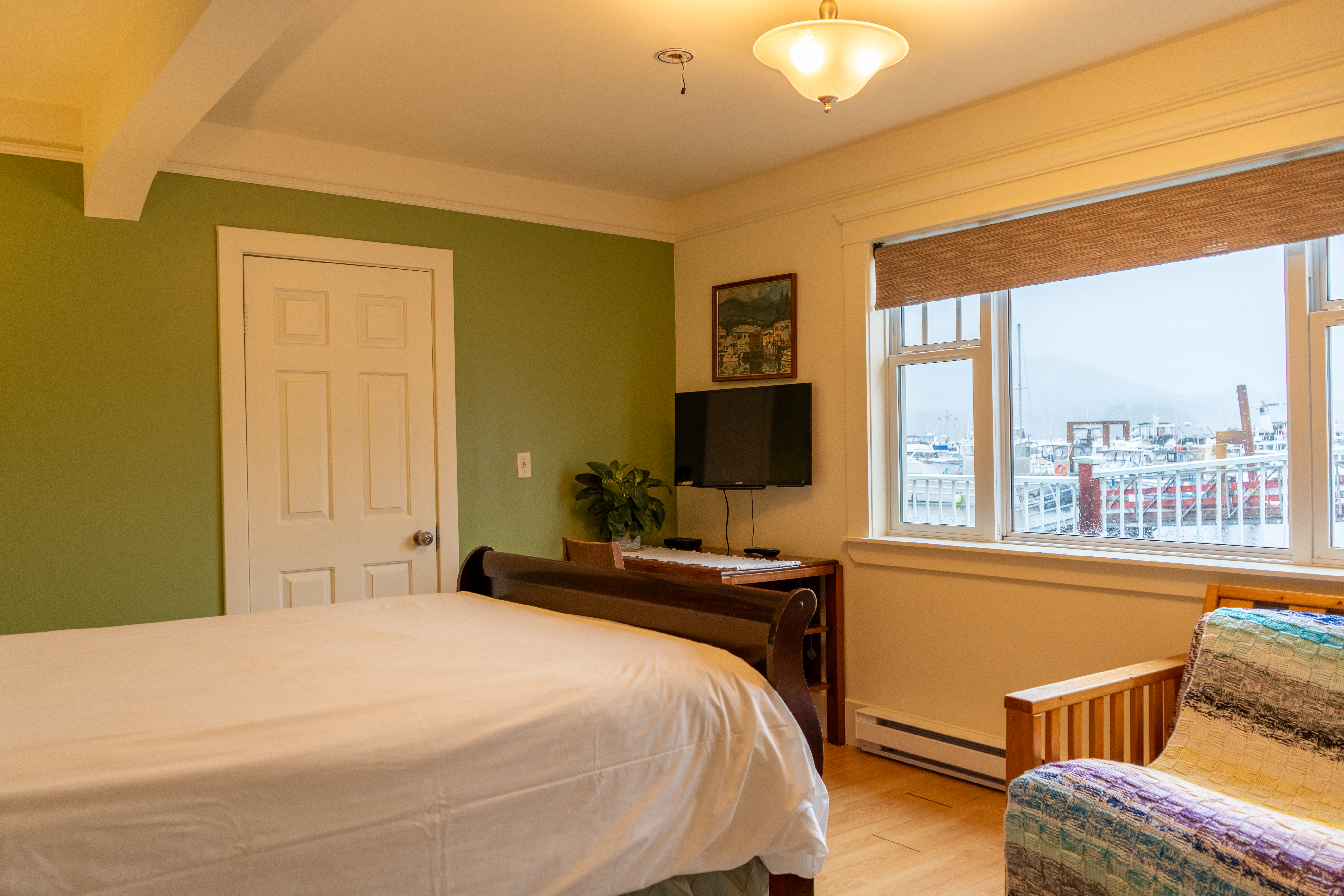Relax in your queen bed with a beautiful view of Ocean and mountains. Furnished with an antique desk, private 4 piece ensuite bathroom and a door that opens directly onto the deck where you’ll get views of the harbour, mountains and yacht club.